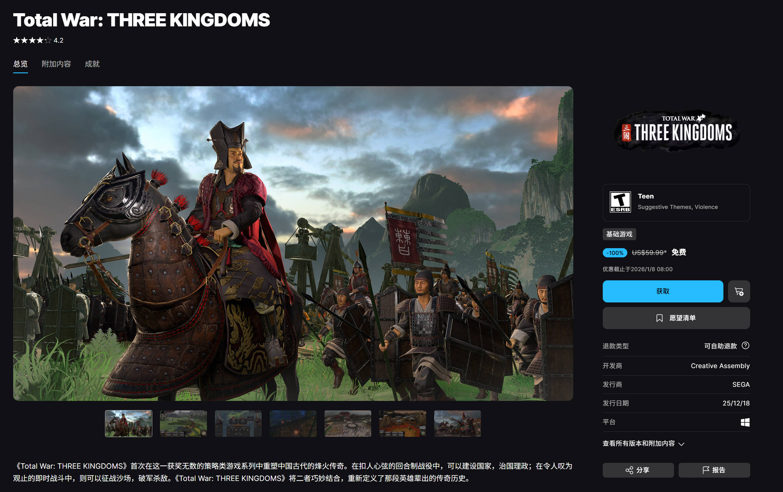 好消息,价值$59.99的全面战争:三国和价值$29.99的无主星渊可以免费下载了!截至2026.01.08日 8:00,有需要的兄弟们尽快下载!