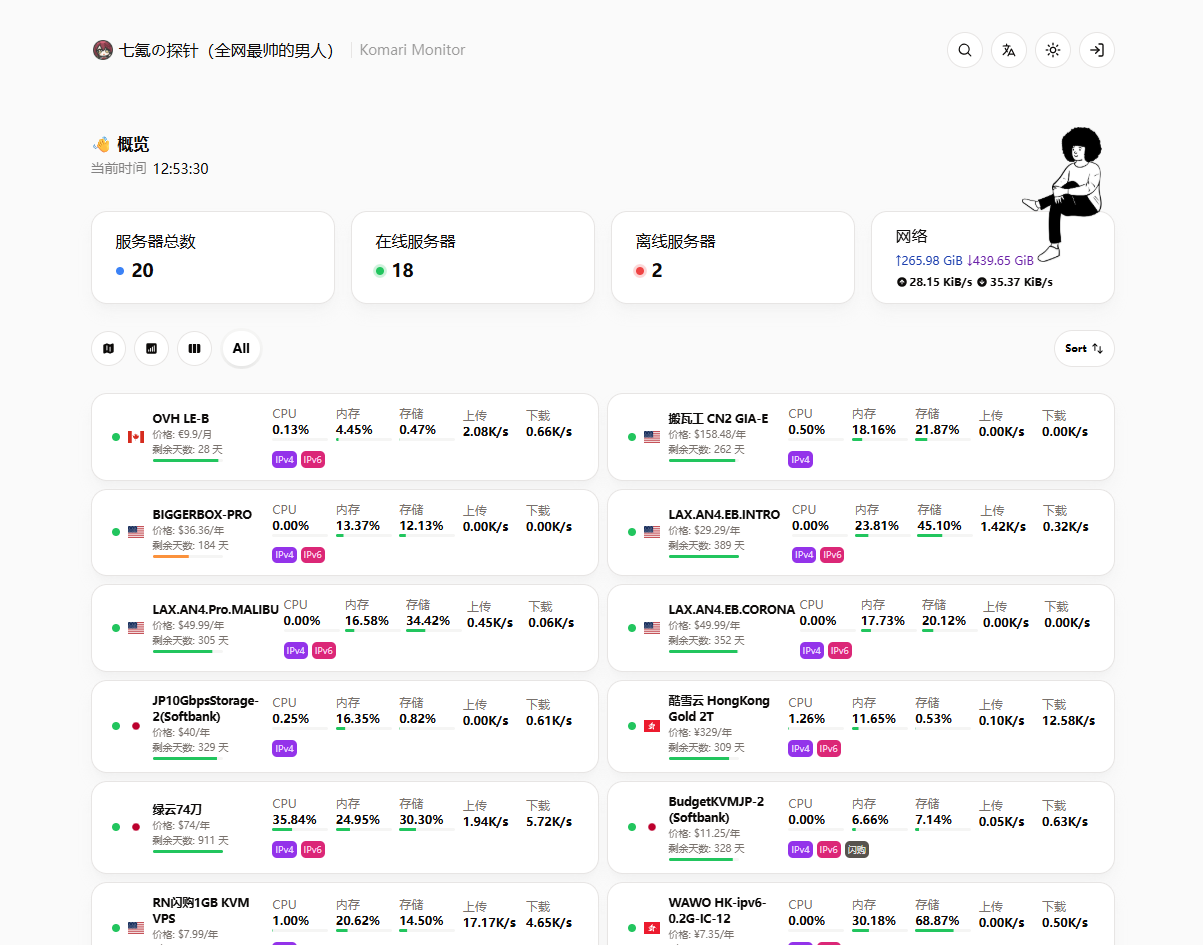 由于komari目前的几款模板外观都较为简陋,目前使用的是仿哪吒主题。